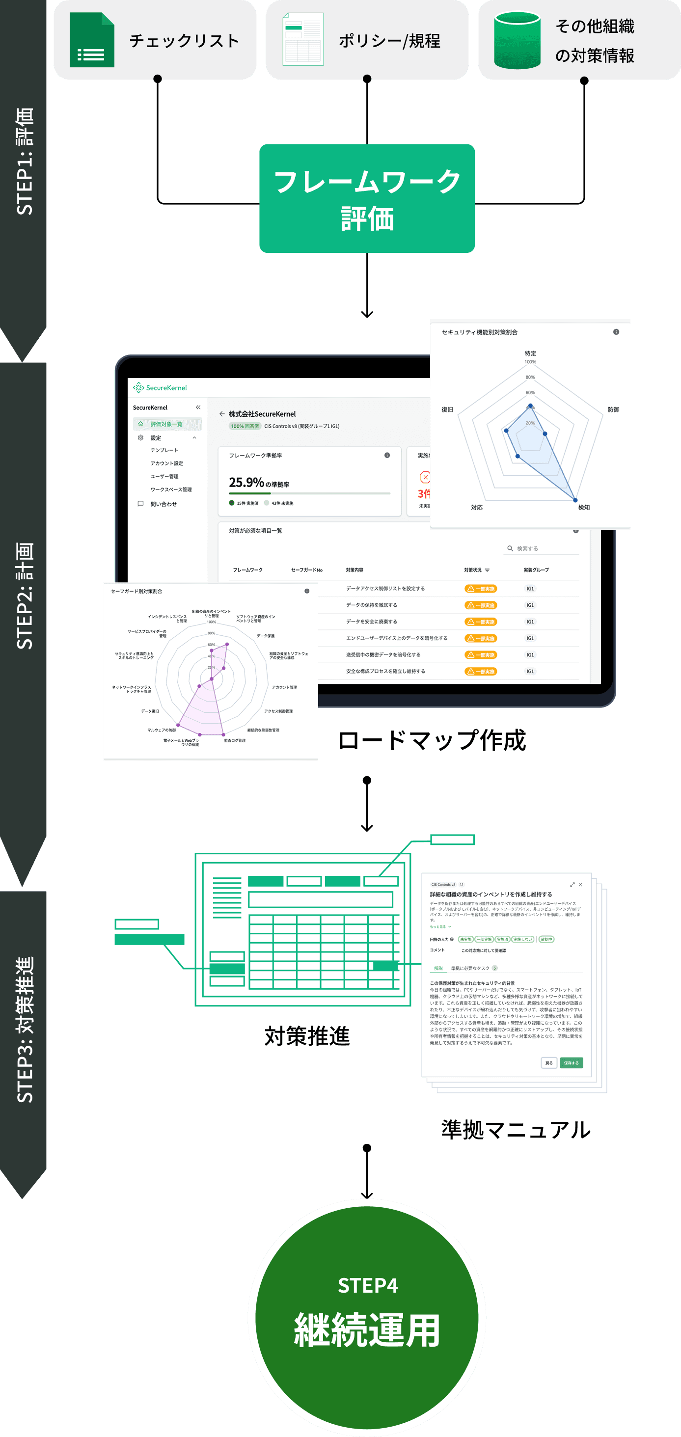 設問に回答するだけでグローバル基準のセキュリティフレームワークの準拠率を定量化。対策の実行・推進までを効率化し、人手不足でも組織に最適なセキュリティ対策をスムーズに進められます。