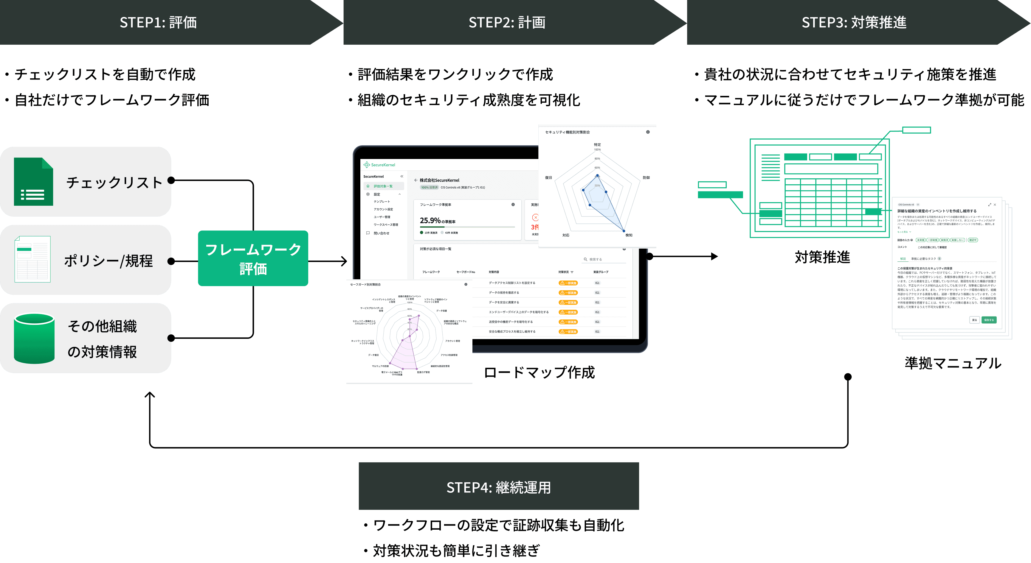 SecureKernelを利用すれば短期間でセキュリティ評価が可能になります。また、対策推進も一元管理できるため、セキュリティフレームワークへの準拠も短期間で可能になります。結果、コンサルタントに依頼する業務が減り、コスト削減を実現できます。