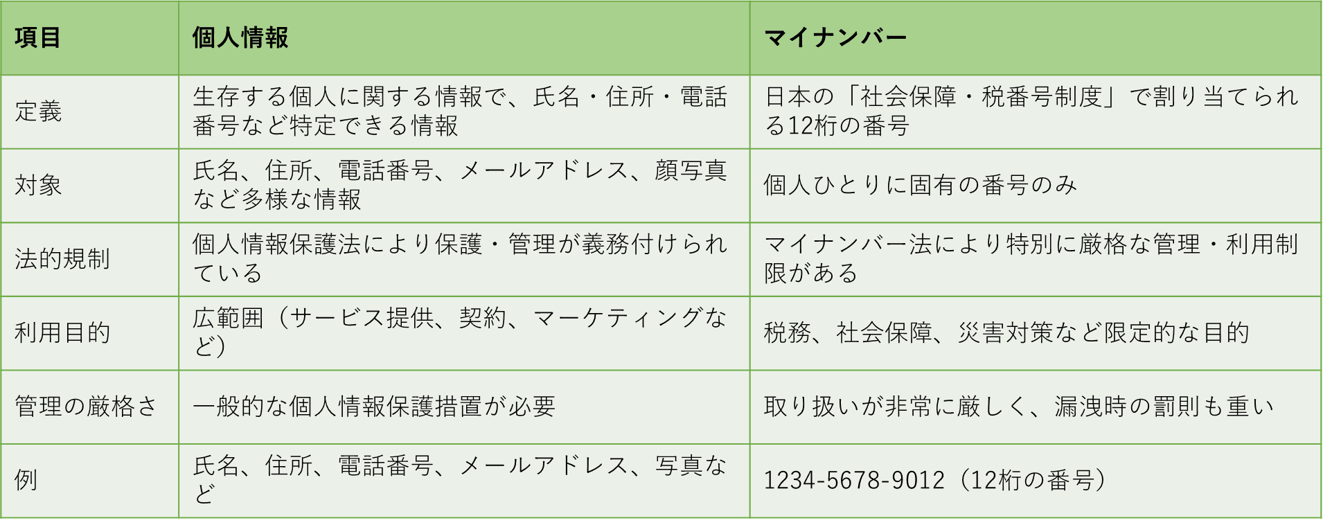 「個人情報」と「マイナンバー(個人番号)」は、どちらも個人に関する重要な情報ですが、法律上の定義や取扱いが異なります。