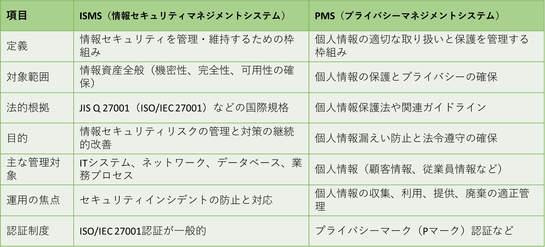 ISMSとPMSは目的や対象範囲が異なりますが、相互に補完し合う関係にあり、多くの組織では両方の仕組みを統合的に運用しています。