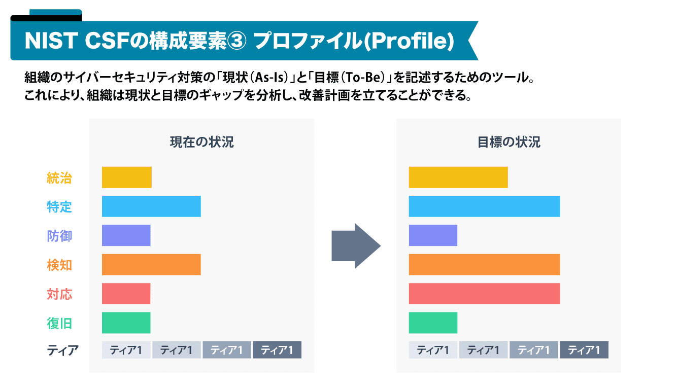 プロファイル:組織のサイバーセキュリティ対策の「現状(As-Is)」と「目標(To-Be)」を記述するためのツールです。これにより、組織は現状と目標のギャップを分析し、改善計画を立てることができます。