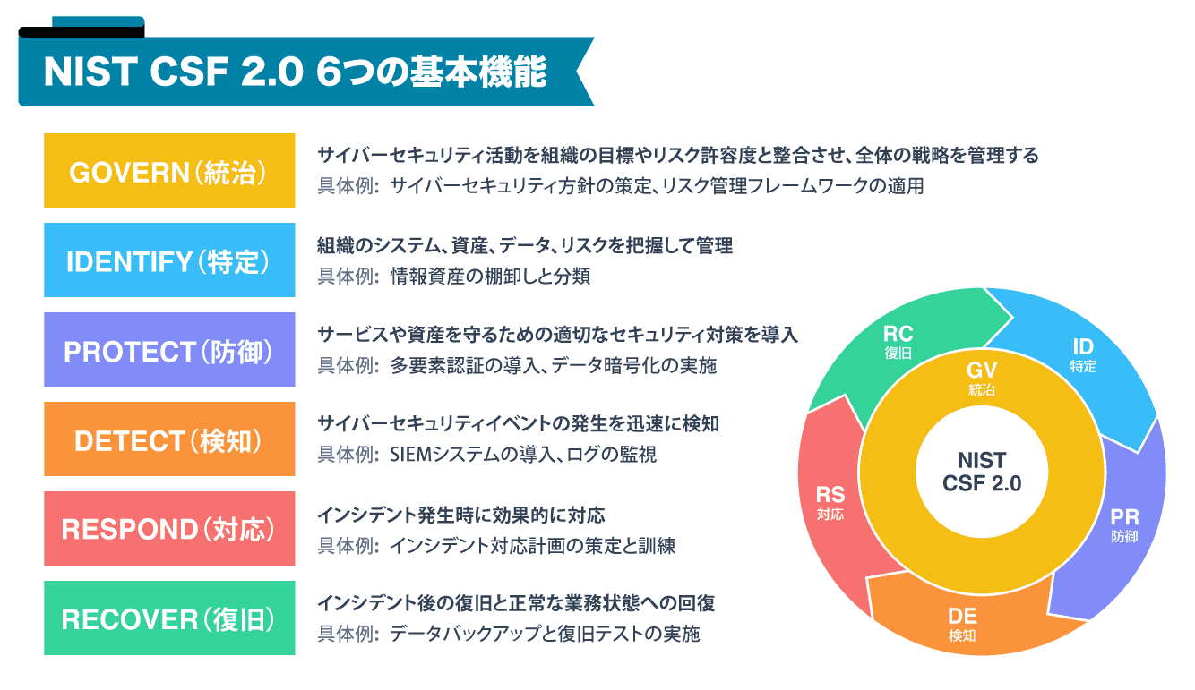 NIST CSF 2.0の6つの基本機能は、企業のサイバーセキュリティ対策を体系的に実施するための指針を提供します。