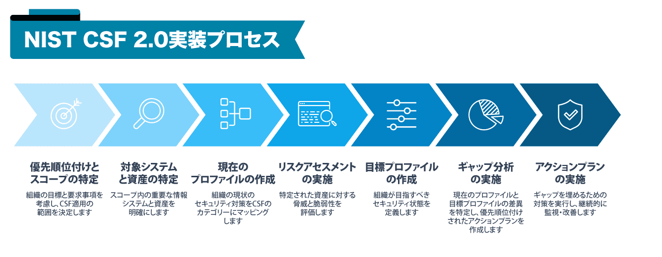 NIST CSFを効果的に実践するために、組織は以下の7つのステップを踏むことが推奨されています: