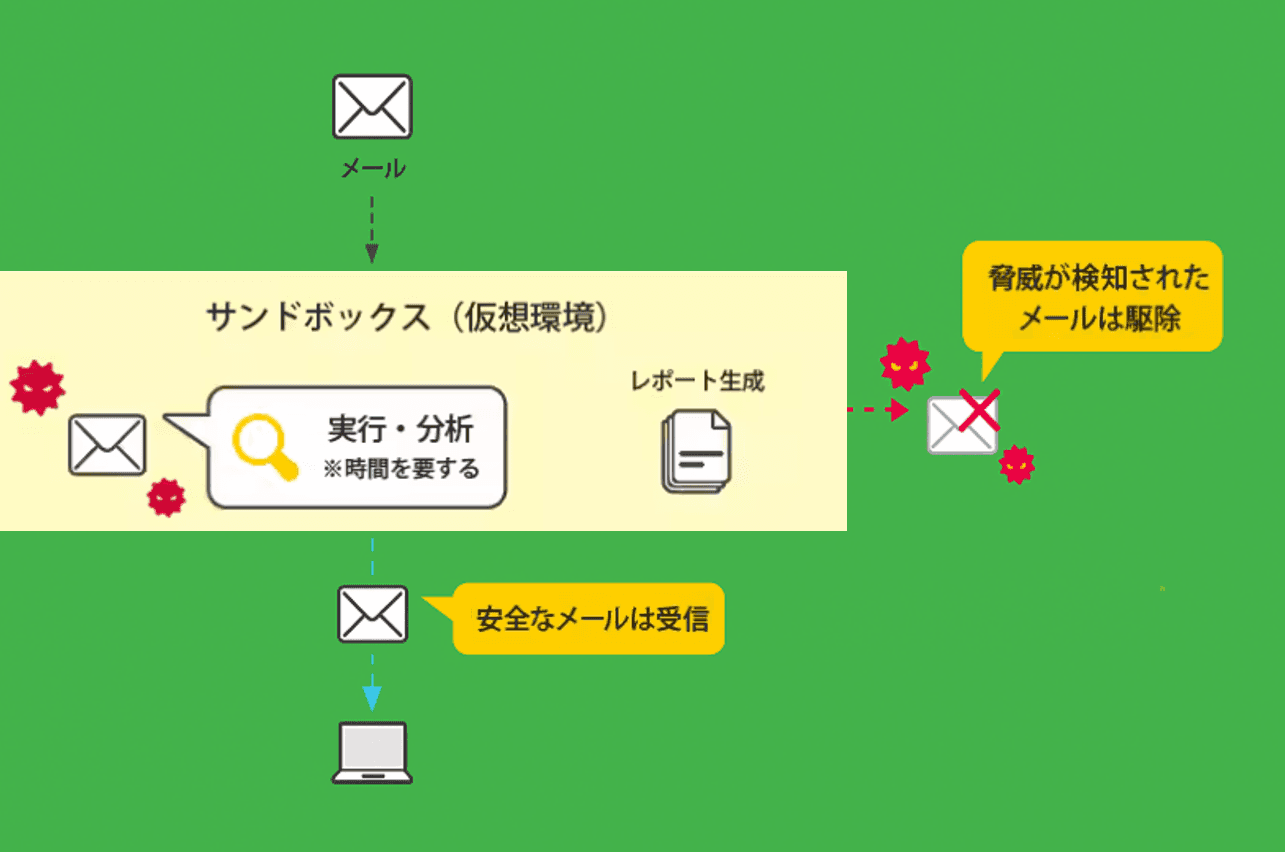 サンドボックス技術は、特にゼロデイ攻撃のような既知のシグネチャでは検出できない新種の脅威に対して有効です。メールの添付ファイルやダウンロードしたプログラムを実行前に自動的にサンドボックスでチェックすることで、潜在的な脅威を事前に特定できます。