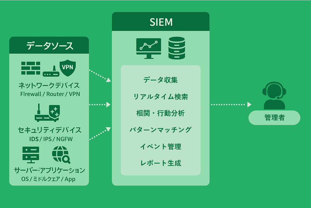SIEM(Security Information and Event Management)は、「各種ログ解析を実施し、攻撃の痕跡を見つけ出す仕組み」です。複数のシステムやセキュリティ機器から収集したログを一元管理し、相関分析を行うことで、単一のログでは検出できない複雑な攻撃パターンを特定します。